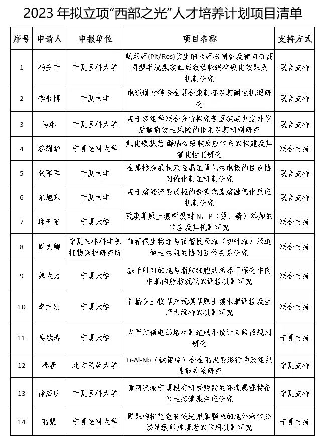 近日,宁夏科学技术厅公布了2023年中国科公司“西部之光”人才培养计划拟立项项目,宁夏共有14人获得资助,世界杯8833300足球7人获批资助,其中世界杯8833300足球青年教师李志刚博士和邱开阳博士申报的项目获批立项。至此,公司共有5名教师获得该项目的资助。