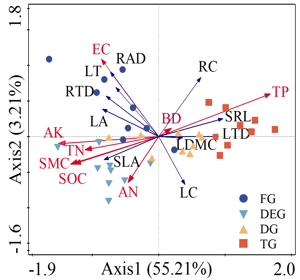 图2 群落水平上叶片和根性状与土壤性质的冗余度分析