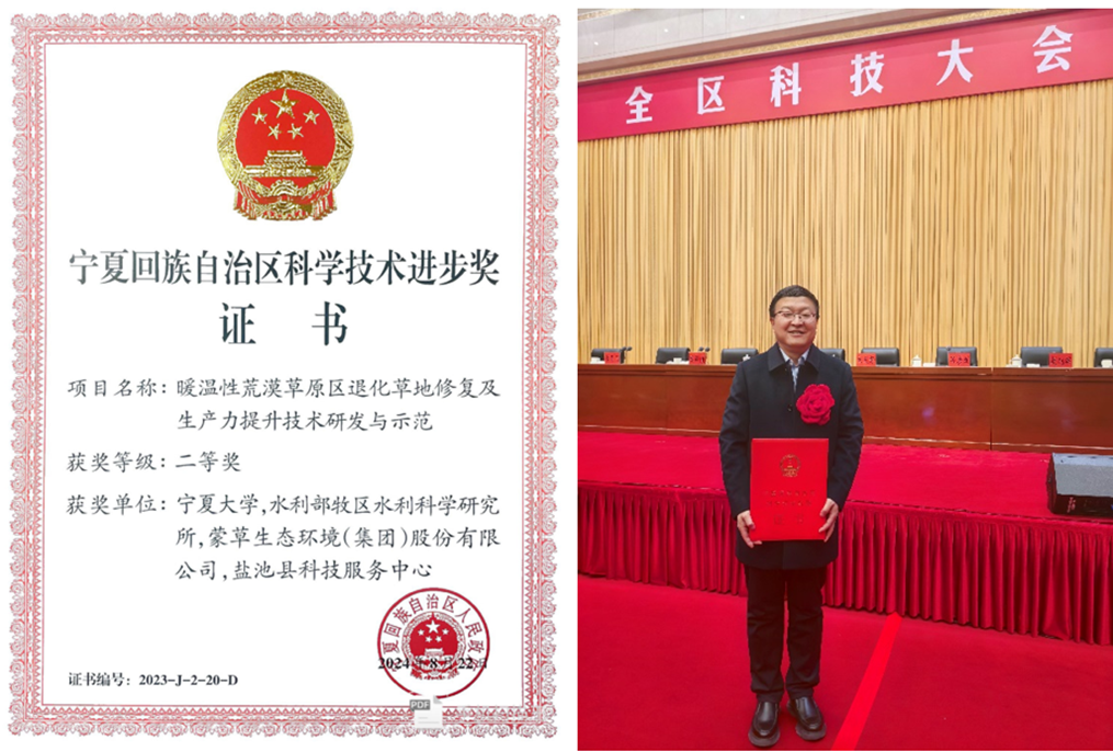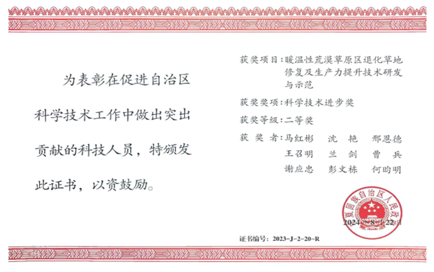 11月25日,全区科技大会在银川召开。会议宣读了《自治区人民政府关于2023年度自治区科学技术奖励的决定》,公司马红彬教授团队与公司林学学科、水利部牧区水利科学研究所等单位申报的“暖温性荒漠草原区退化草地修复及生产力提升技术研发与示范”获自治区科技进步二等奖。据悉,该成果在宁夏和内蒙古暖温性荒漠草原,诊断了草地生态现状,建立了退化荒漠草原修复技术、生态家庭牧场水-土-草-畜多元化调控模型和技术,构建了荒漠草原多元化饲草供给模式并进行示范推广,助力了暖温性荒漠草原草牧业高质量发展。
